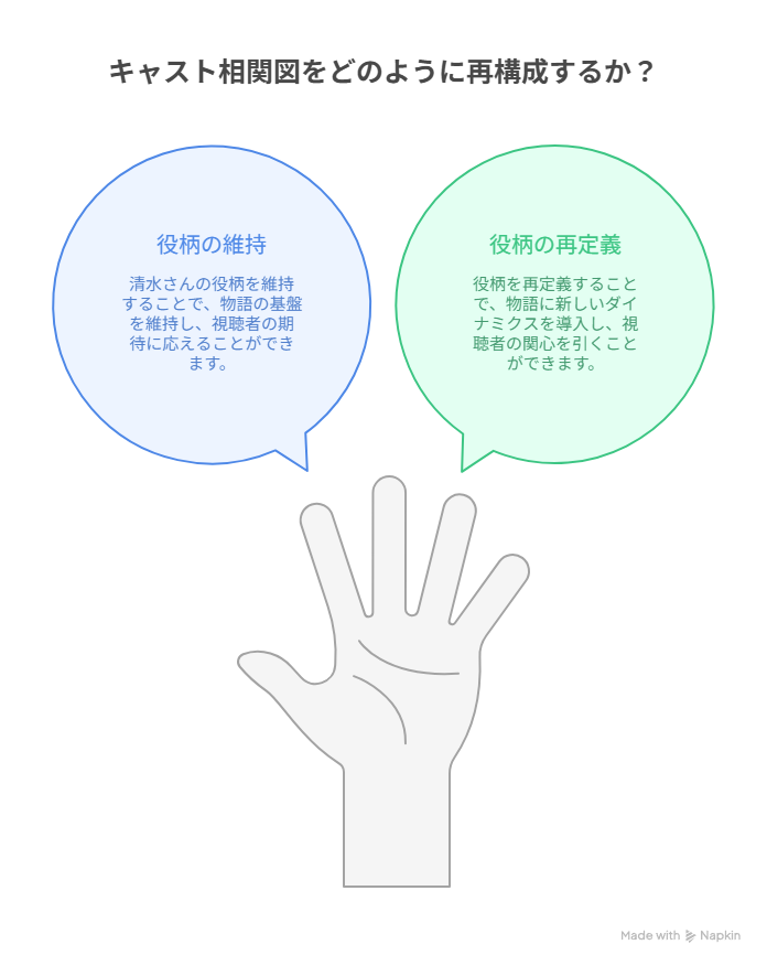 代役が決まれば相関図は書き換えられ、物語の一部も再構成されることになります。これは単なる“差し替え”ではなく、場合によってはキャラクター像そのものが調整されることもあり得ます。