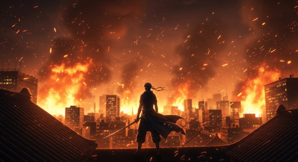- 炎上:街が燃えるのは、ただの破壊じゃない。凝り固まった運命が焼き直される瞬間。